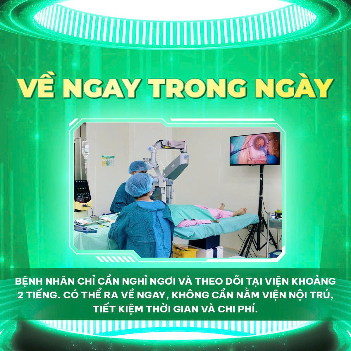 + Không nằm viện: Thời gian mổ chỉ 5-10 phút. Cô chú chỉ cần nằm theo dõi 1–2 giờ là được về nhà ngay, tiết kiệm thời gian và chi phí..